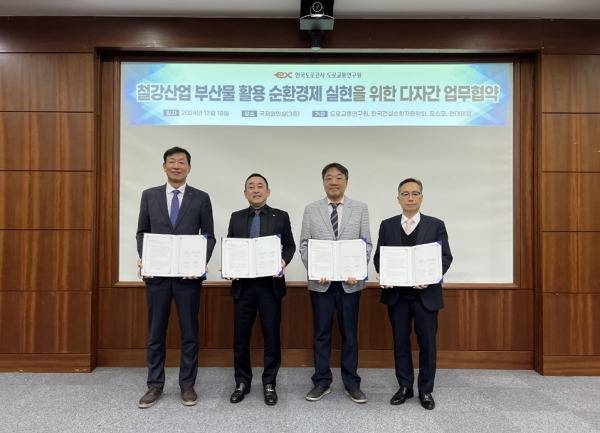 포스코가 18일 한국도로공사 도로교통연구원, 한국건설순환자원학회, 현대제철과 철강부산물 활용 고속도로 건설 및 순환경제 실현을 위한 업무협약을 체결했다.