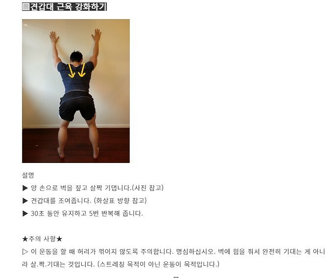 견갑골 모으기: 양쪽 어깨를 뒤로 모으며 날개뼈를 조이기
