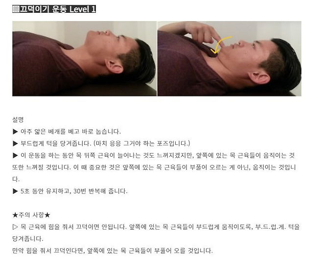 방법: 등을 곧게 펴고 턱을 당기면서 목 뒤로 밀어 넣는 느낌으로 움직이기