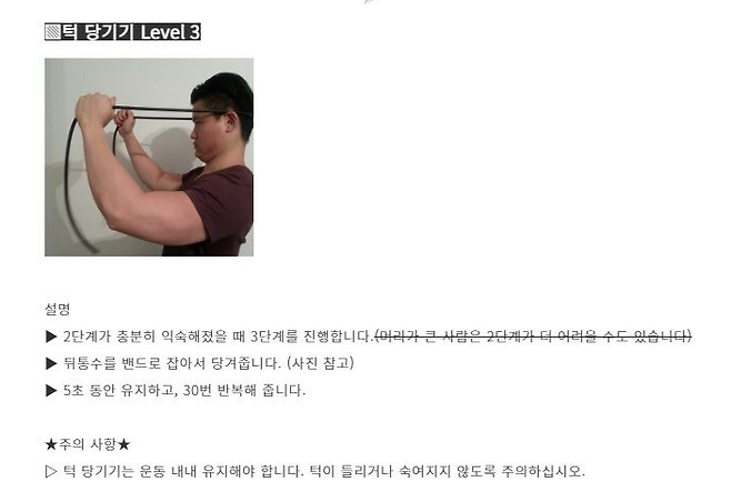 주의: 통증이 있거나 무리하게 당기지 말고 천천히 진행