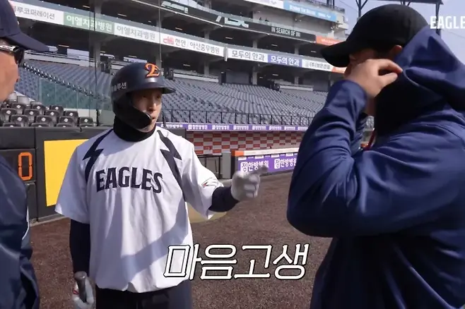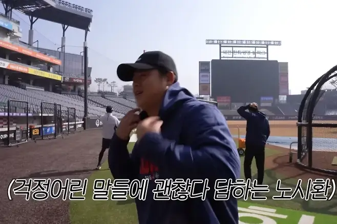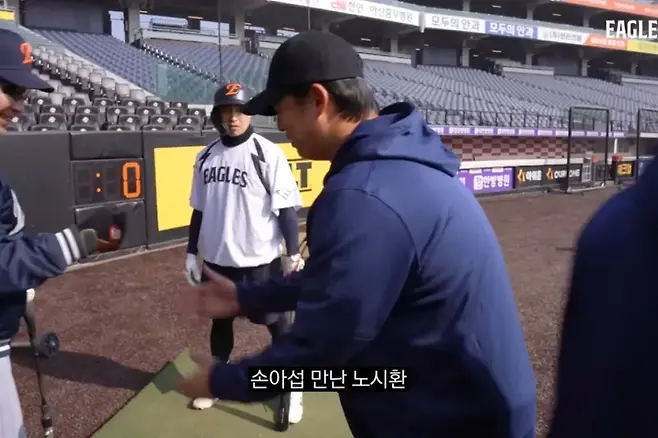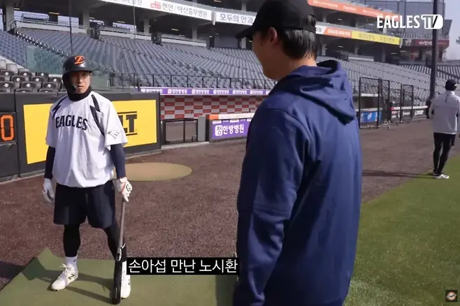 구단 공식 유튜브 채널 'Eagles TV'에 공개된 영상 속에서 노시환은 김경문 감독과 코치진에게 인사를 마친 뒤 배팅 훈련 중이던 손아섭과 마주쳤다. 코치가 노시환에게 "고생했다"며 악수를 건네자, 이를 지켜보던 손아섭의 반응이 압권이었다.