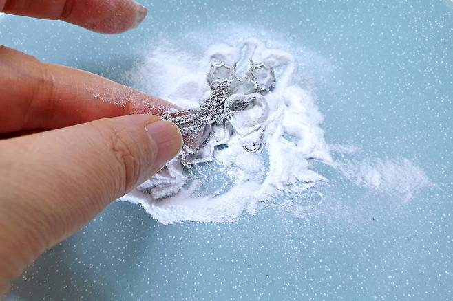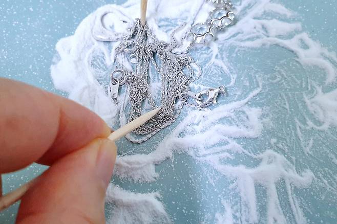 방법은 넓은 그릇에 엉킨 목걸이를 올려주시고 베이킹소다를 뿌려주세요. 목걸이줄에 골고루 비벼가며 살살 풀어주세요. 그러면 베이킹소다가 목걸이줄 사이에 마찰을 줄여줘서 그냥 무작정 풀 때보다 훨씬 쉽게 풀 수 있게 해 줍니다.