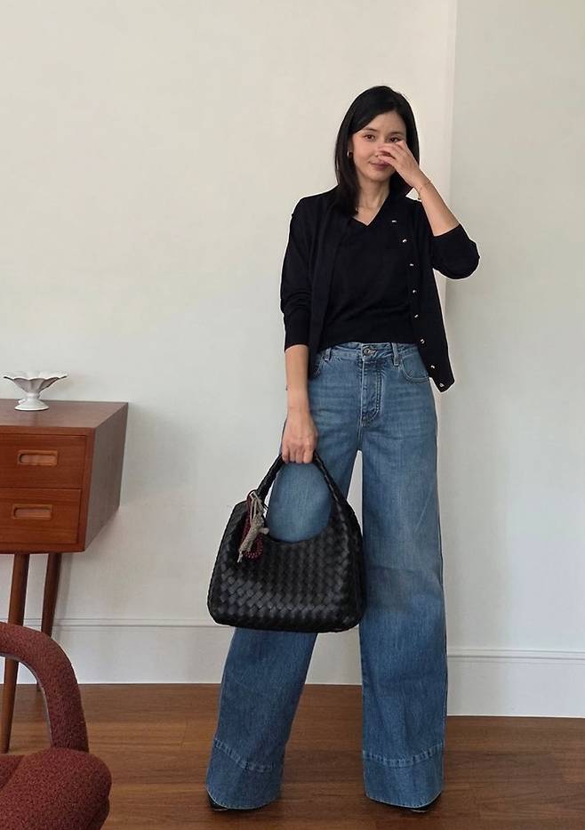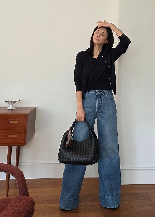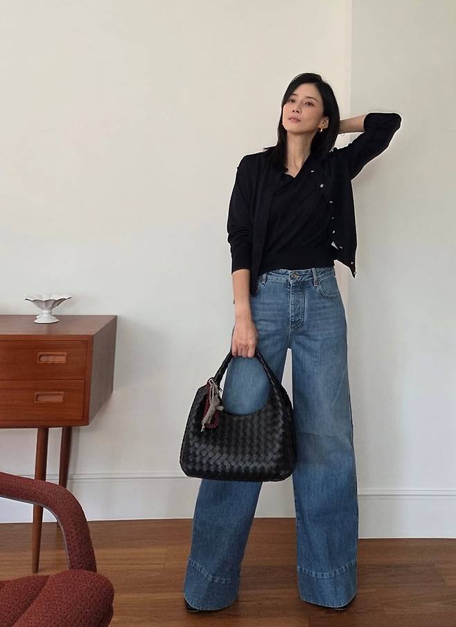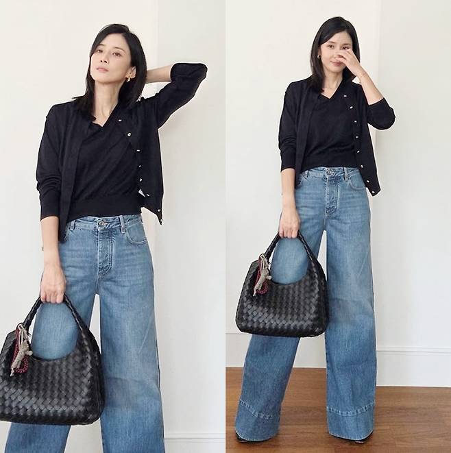 공개한 사진에서 이보영은 블랙 브이넥 티셔츠에 같은 컬러의 카디건을 레이어드하고, 하이웨이스트의 와이드 데님 팬츠를 매치해 깔끔한 룩을 완성했다.