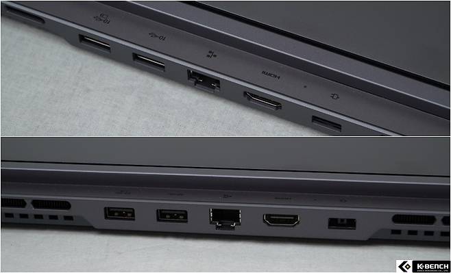 일반적으로 노트북들의 대부분이 전부 하판의 좌측, 혹은 우측에 포트를 대거 제공하는 편이다. 특히 USB 같은 경우가 자주 활용될 여지가 있기 때문에 그러한 부분이 많은데, 이번 레노버 리전 슬림 5i 16IRH8 i7 모델은 대부분의 핵심 포트들을 후면으로 몰아 버린 모습을 보여준다.