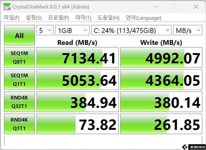 마지막으로 성능 테스트는 앞에서 언급하지 않았지만 기본 제공되는 스토리지 테스트다. NVMe 기반의 SSD가 탑재된 것을 확인할 수 있었는데, 매우 고성능 M.2 NVMe가 탑재된 것으로 보여진다.