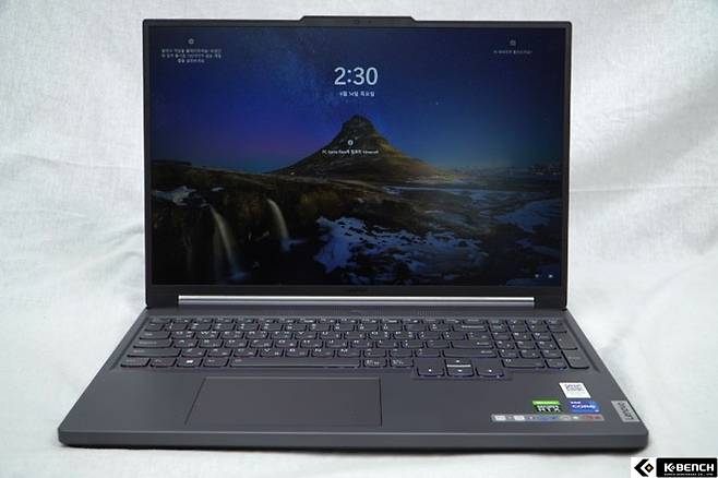 노트북을 열었을 때 역시 16인치 기반의 디스플레이가 제공되며, 풀배열 키보드가 제공되는 모습을 볼 수 있다.