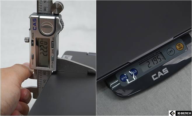 컴팩트한 디자인과 함께 백팩 정도에는 수납하며 들고다닐만한 수준이라고 보여지는데, 무게의 경우에는 옵션제품에 따라 다를 수 있지만, 이번 케이벤치에서 살펴본 모델의 경우 2.2kg 수준이며, 두께의 경우에도 22mm 급으로 확인된다.