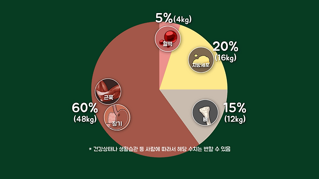 80kg의 남성을 기준으로 했을 때 이 사람을 구성하는 조직들을 물질이 비슷한 것들로 분류해 보면 크게 혈액, 지방세포, 뼈, 근육·장기 등으로 분류할 수 있으며, 각 조직이 몸을 구성하는 비율과 질량을 따져보면 아래와 같습니다.