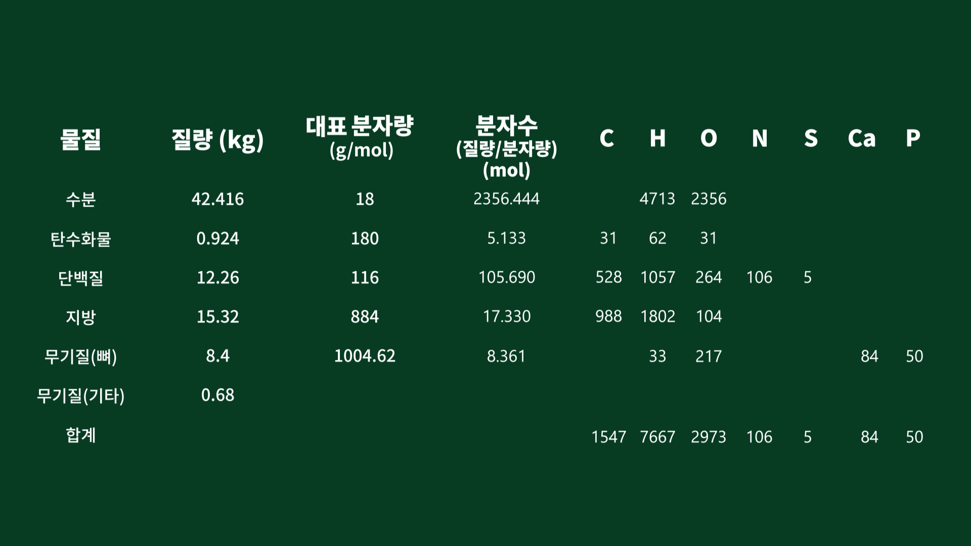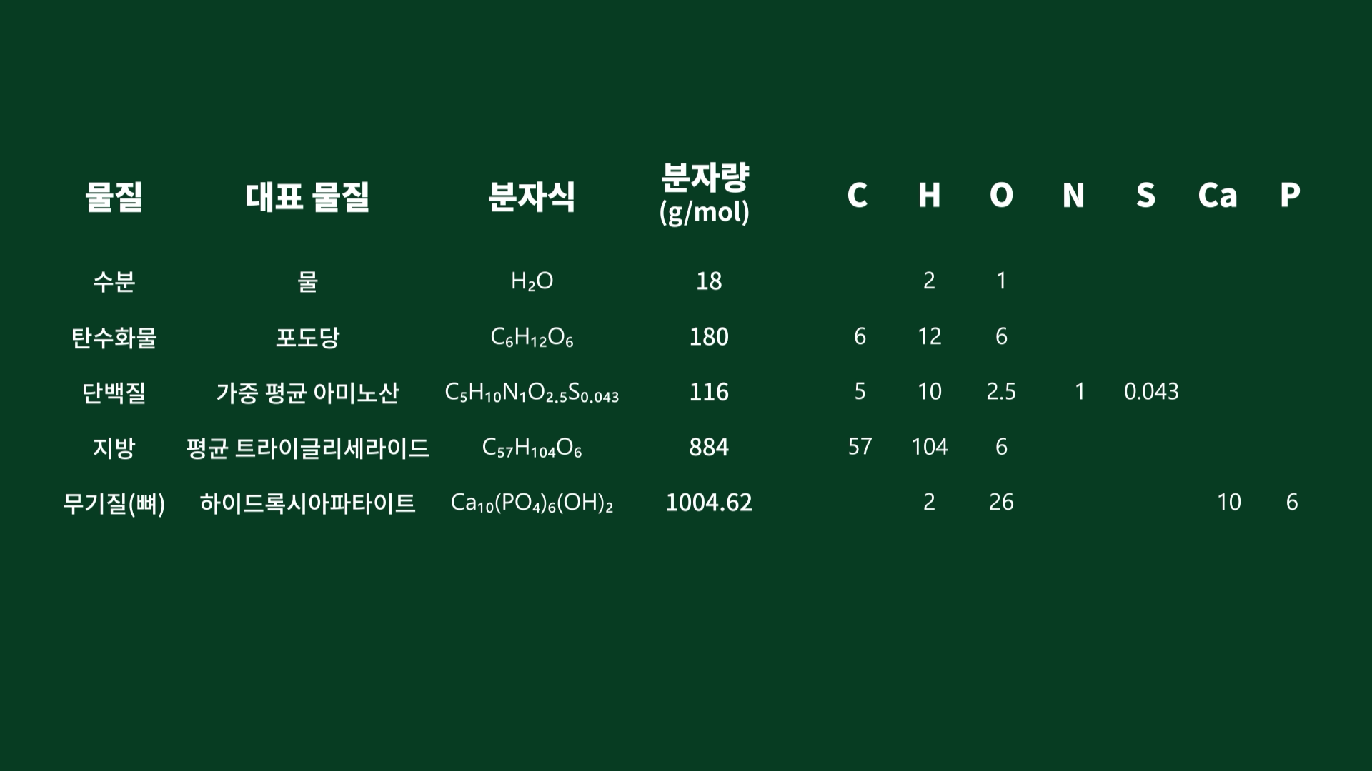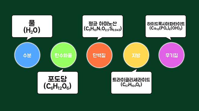 이에 따라 수분은 물(H₂O), 탄수화물은 포도당(C₆H₁₂O₆), 단백질은 평균 아미노산(C₅H₁₀N₁O₂.₅S₀.₀₄₃), 지방은 트라이글리세라이드(C₅₇H₁₀₄O₆), 뼈의 무기질은 하이드록시아파타이트(Ca₁₀(PO₄)₆(OH)₂)가 대표한다고 볼 수 있습니다.