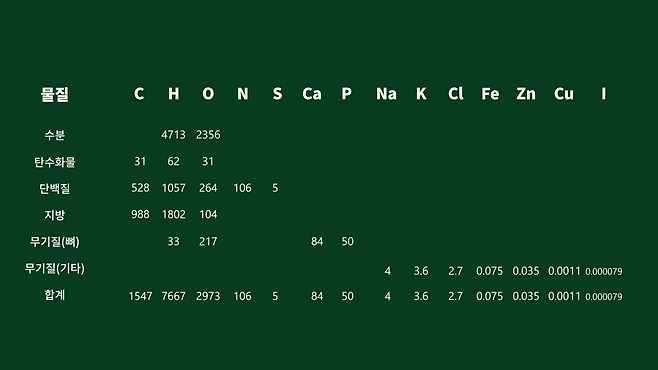 이렇게 계산한 값을 토대로 각 성분의 대표 분자를 선정해 사람의 분자식을 구해보도록 하겠습니다. 대표 분자 선정은 생리학적으로 각각의 분자가 체내에서 가장 많은 형태로 존재하고, 기능적으로 주요한 구조·저장·수송 역할을 실제 담당하는 기준으로 고려했습니다.