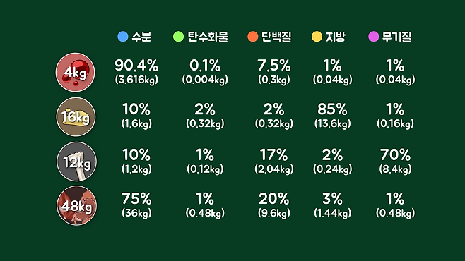 각 조직은 수분, 탄수화물, 단백질, 지방, 무기질 등의 성분이 각기 다른 비율로 조합되어 만들어진 것인데, 이러한 성분들이 각 조직에서 어떤 비율과 질량으로 구성되어 있는지도 따져보면 아래와 같습니다.