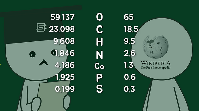 참고로 이렇게 계산한 값을 대략적으로 알려진 인간의 원소 조성 비율(*위키피디아 자료)과 비교해 보면 약간 다릅니다. 아무래도 계산의 편의를 위해 반올림한 것과 대표 분자의 차이, 미량 원소의 무시 등이 원인일 겁니다.