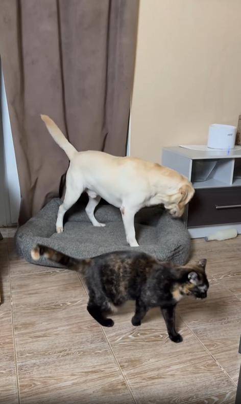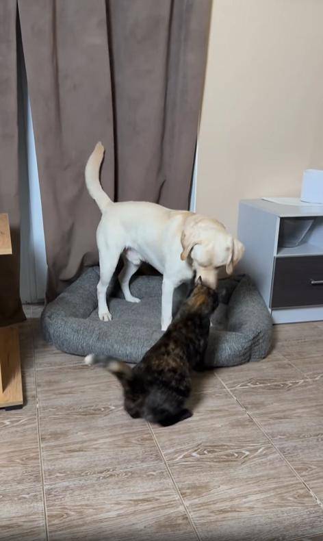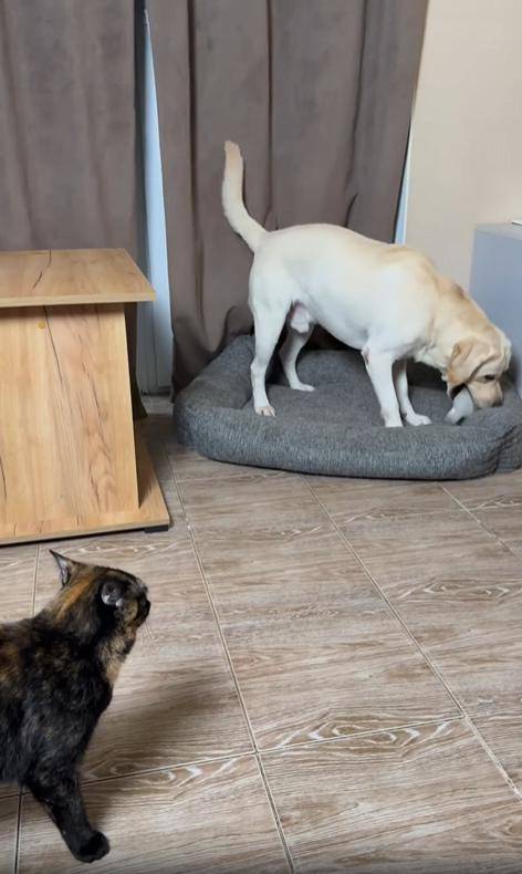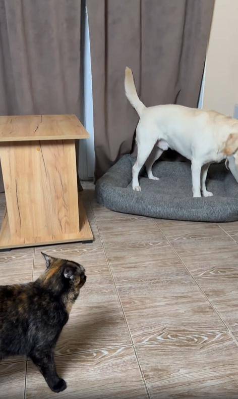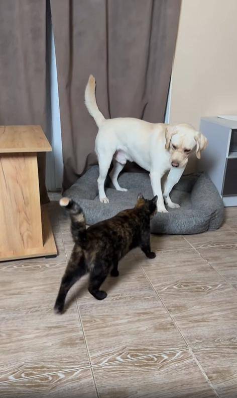 그런데 그 장면을 멀리서 조용히 지켜보는 존재가 있습니다. 바로 고양이입니다. 소리에 귀가 조금씩 젖혀지고, 눈빛은 어느 순간 날카롭게 바뀌어 있습니다. 고양이는 말없이 천천히 다가오더니, 강아지의 코앞에 이르자, 망설임도 없이 앞발을 쭉 뻗어 강아지의 얼굴을 ‘퍽!’—한 대 가볍게 치고는 아무 일도 없었다는 듯 유유히 지나쳐 버립니다.