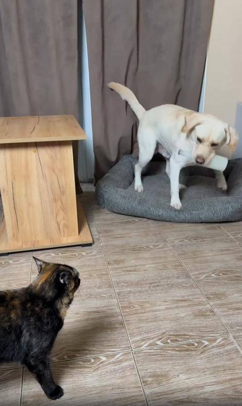 강아지는 눈을 깜빡이며 얼어붙습니다. 물병은 입에서 툭 떨어지고, 방 안은 다시 조용해졌습니다. 마치 고양이가 “그만 좀 해”라고 말하는 듯한 순간이었죠. 고양이의 단호한 행동, 그리고 그 표정—참고 참다 결국 결단을 내린 듯한 모습이 무척 인상 깊습니다.