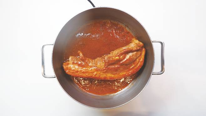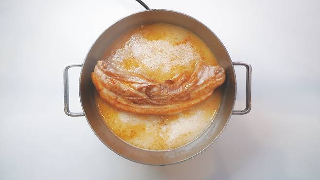 6) 막걸리가 거의 다 졸아들 때까지 약불에서 40분간 삼겹살을 돌려가며 익힌다.