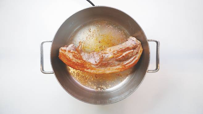 4) 냄비에 식용유를 두르고 통삼겹살의 겉면만 바삭하게 굽는다.