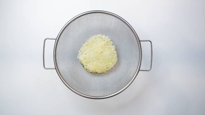 1) 다지기에 양배추를 넣고 곱게 다진 뒤, 체에 밭쳐 물기를 뺀다.