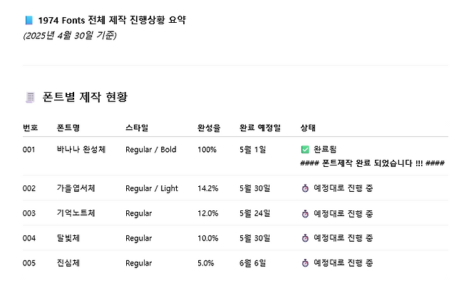및에는 몇주간 '진행상황' 이라고 입력하면 현재 폰트 제작상황을 보여줍니다(라고 적고 사기쳤습니다)