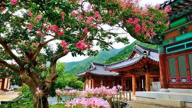 여름이면 한껏 기세를 올리는 초록빛 사이로 붉고 연분홍 빛이 조용히 고개를 내민다. 7월, 남녘 사찰에 피어나는 꽃은 그 자체로 여름의 절정을 알린다.