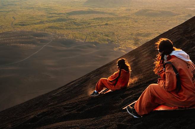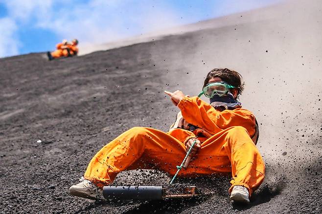 이곳은 검게 덮인 활화산에서 '화산 서핑'을 체험할 수 있는데요.