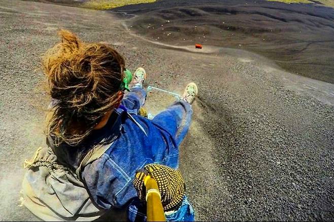 언뜻 보면 사막에서 타는 샌드 보딩처럼 보이기도 하지만 화산재 위에서 타는 썰매라는 점이 가장 큰 차이점입니다.
