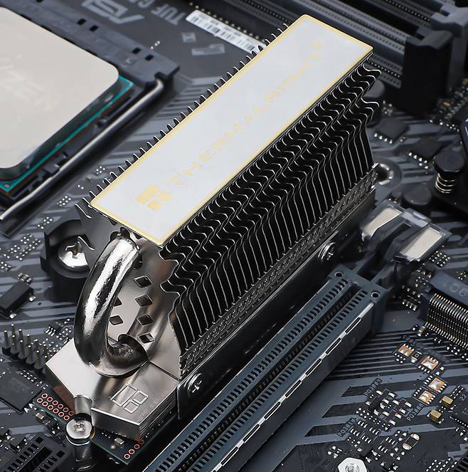 메모리 모듈보다 작은 M.2 SSD도 최근 부각되는 발열 부위 중 하나다. 메모리 모듈과 동일하게 PCB 기판에 낸드 플래시 메모리 칩이 부착되어 있으므로 발열이 없으면 이상할 정도. 읽기, 쓰기 속도가 올라가면서 발열량은 덩달아 올라가기 시작한다. 또한, M.2 SSD의 위치가 메인보드 거의 정중앙에 해당되므로 다은 방향으로 열이 전도될 가능성도 있기 때문에 특히 신경 쓰이는 부분이다.