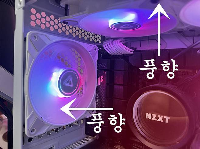PC를 조립할 때, 혹은 쿨링팬을 추가로 장착할 때 쿨링팬의 방향에 집중하자. 선풍기 모양의 쿨링팬은 공기의 방향이 일방적이므로 흡입구와 배출구에 맞게 앞면, 뒷면을 잘 살펴 가며 설치해야 한다. 앞, 뒤 모양이 달라 통일된 디자인을 꾀하려는 유저들은 역방향 쿨링팬을 구입하는 경우도 많다. 위 필자가 실제 사용하는 PC의 경우 역방향 쿨링팬을 사용하지 않고 밑면에서 외부 공기를 흡입해 메인보드, 그래픽 카드를 거쳐 CPU 위에서 다시 후면, 상단, 측면으로 배출되는 구조다. 마음같아선 밑면의 쿨링팬을 역방향으로 맞추고 싶었으나 상황이 여의치 않아 뒤집힌 모양이 그대로 노출되었다.