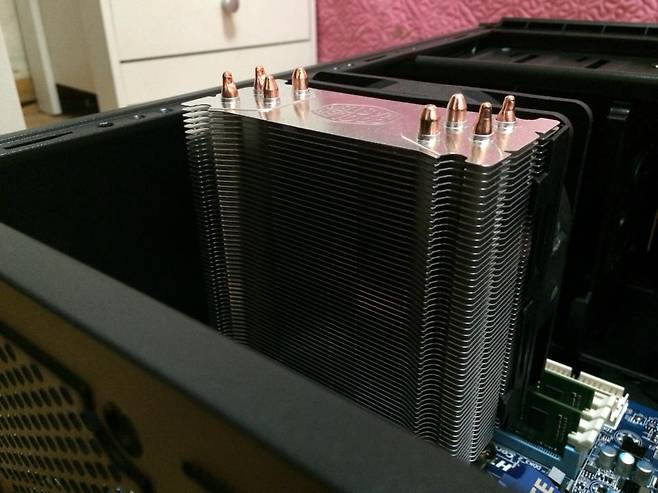 덕분에 공랭 쿨러를 구입하기 위해선 자신의 케이스가 어느 높이까지 소화 가능한지 꼭! 무조건! 체크해야 한다. 아무거나 덜컥 사서 장착했다가 위 사진처럼 케이스 높이를 초과해버려서 옆판을 닫지 못하는 초유의 사태가 벌어질 수 있다. (사진은 필자가 경험한 실제 상황이다. T.T)