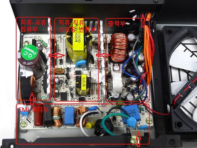 따라서 파워서플라이 제조사는 자체 쿨링 솔루션을 파워서플라이 내부에 숨겨놓고 있다. 일단 큼지막한 쿨링팬이 떡하니 자리 잡고 있다. 이는 내부의 열을 밖으로 빼는 역할을 한다. 일부 제품은 전원이 꺼진 상태에서도 파워서플라이 내부에 남아있는 열기를 배출하는 기술을 적용하고 있어 별도의 쿨링 솔루션을 고민할 필요는 없어 보인다. 다만 조립 시 파워서플라이 내부 쿨링팬에서 공기가 잘 빠져나갈 수 있도록 장착 방향을 잘 고려하자. 자칫 파워의 열이 PC 내부를 향해 뿜어 나올 수 있기 때문이다.