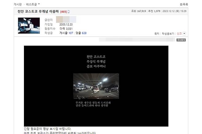 지난 13일 온라인 커뮤니티 보배드림에 ‘천안 코스트코 무개념 아줌마’라는 게시물이 업로드 됐다. 게시물 작성자 A씨는 ‘긴말 필요없이 영상 보시길 바랍니다’라는 말을 시작으로 자신이 대형마트 주차장에서 겪은 황당한 일을 설명하기 시작했다.