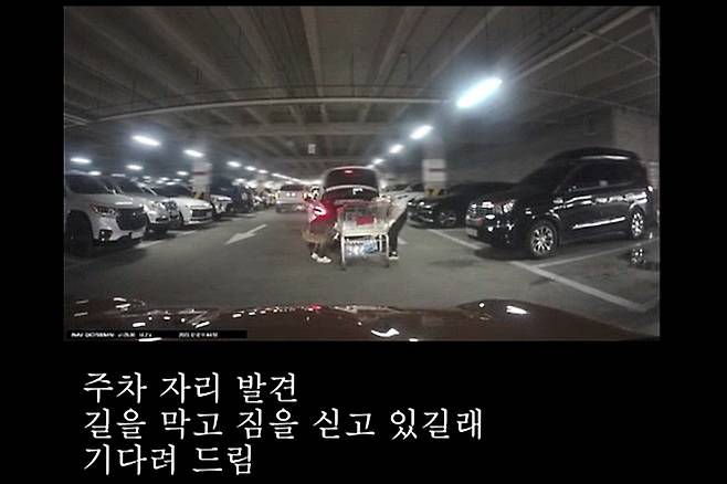 당시 A씨는 주차장 내 빈 주차칸을 찾고 있던 중이었다. 한창 자리를 찾던 와중 길을 막고 짐을 싣는 중년 여성 B씨의 차량을 마주한 A씨. 그는 B씨 차량 옆으로 난 빈 주차칸에 주차를 하기 위해 차량을 세우고 기다리기 시작했다. 그러나 B씨가 곧이어 보인 충격적인 행동에 A씨는 당황할 수밖에 없었다.
