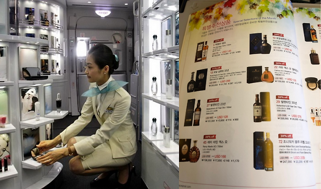 기내 면세품을 구매할 때에는 기내에 준비된 면세품 책자를 보고 구매 원하는 상품을 승무원에게 요청하면 됩니다. 또 기내에서도 마찬가지로 쿠폰과 세일, 이벤트 등 적용을 받을 수 있어 상품에 따라 출국장 면세보다 저렴하게 구입할 가능성도 있습니다.