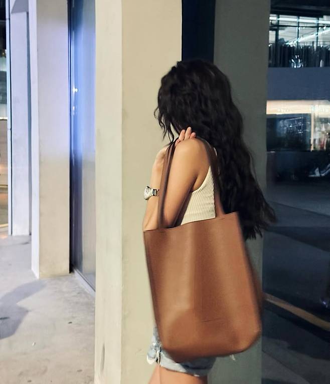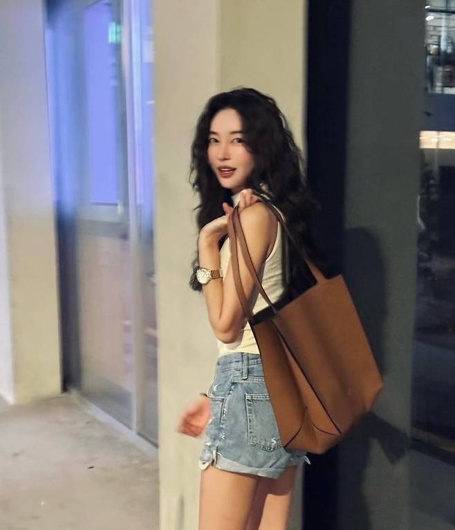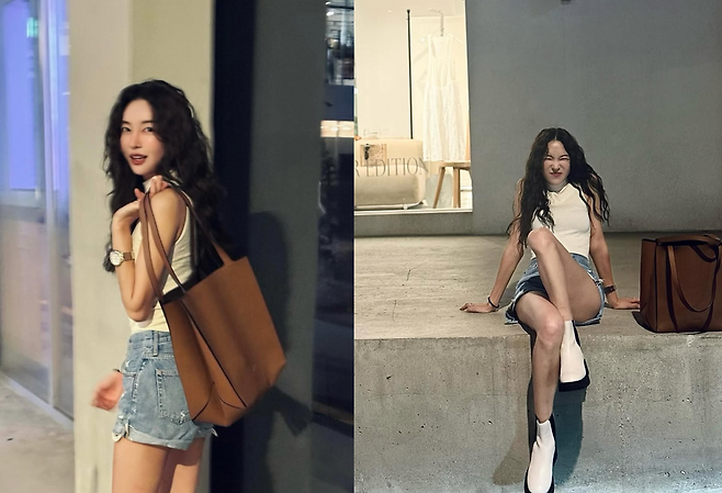 기본 아이템인 화이트 민소매 톱과 데님 쇼츠에, 예상치 못한 아이보리 청키 부츠를 매치한 것이 '신의 한 수'. 자칫 평범할 수 있는 여름 캐주얼룩에,