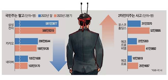 소액주주가 100만명이 넘어 '국민주'로 불리는 삼성전자·카카오·네이버의 개미투자자 수가 감소한 것으로 나타났다. 반면 올해 들어 주가가 급등한 2차전지(배터리) 관련주들의 소액주주 수는 2배가량 늘었다.