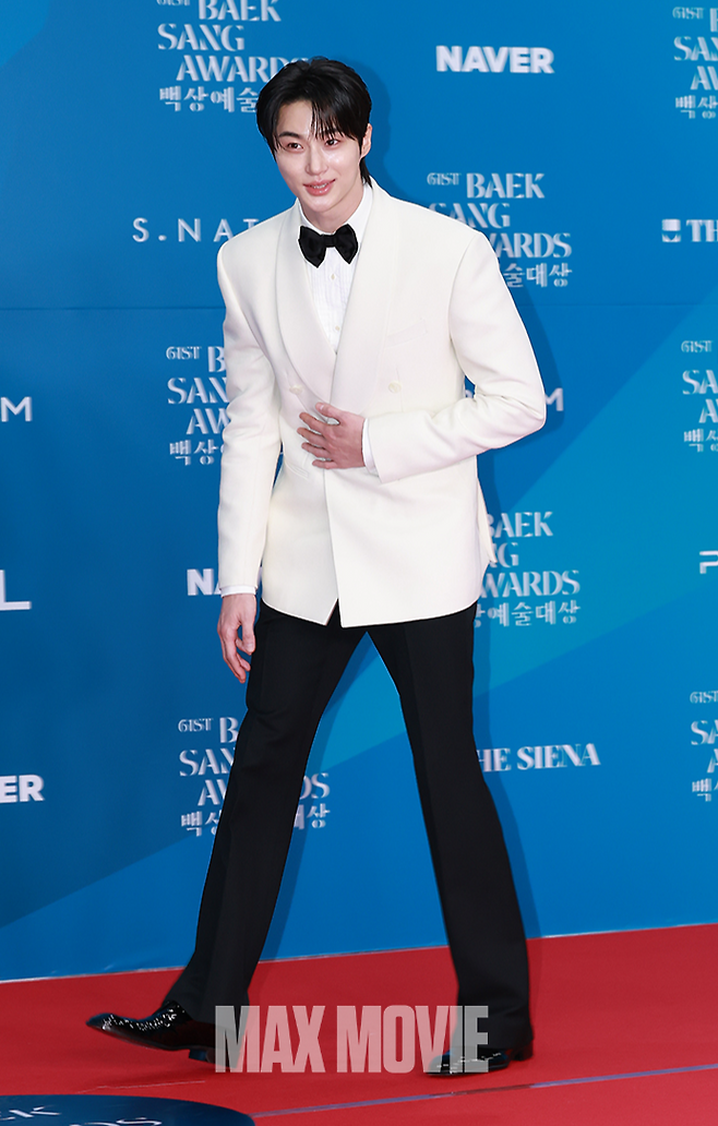 클래식한 흰색 턱시도에 블랙 타이를 매치해 세련된 룩을 완성했어요. 훤칠한 키에 블랙앤화이트 룩을 연출해 시선을 사로잡았죠.