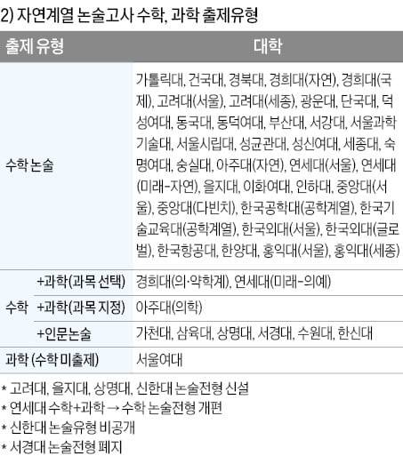 자연계 논술은 수학 단독 출제가 가장 많다. 이 외 수학+과학(과목 선택/과목 지정), 수학+인문논술, 과학 단독 출제 유형으로 구분할 수 있다. 올해 주요 10개 대학 내에서는 연세대, 고려대, 성균관대, 서강대, 한양대, 중앙대, 경희대(의약학 제외), 이화여대가 수학만 출제할 것으로 예상된다. 경희대 의약학계열은 수학을 기본으로 하면서 과학 과목 중 지구과학을 제외한 물리, 화학, 생명과학 중 한 과목을 선택해 응시한다.