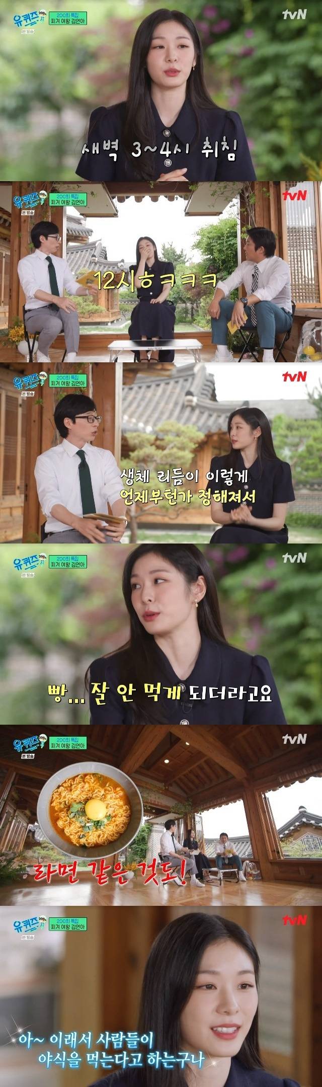 이날 김연아는 최근 일과를 묻자 "진짜 뭐 없다. 되게 늦게 자고 늦게 일어난다. 새벽 3, 4시 자고 (12시쯤에 기상한다). 이렇게 남들 열심히 일하고 점심 먹을 때 일어나니 '이렇게 살아도 되나' 싶은데 리듬이 이렇게 됐다"고 털어놓았다.