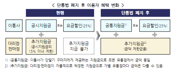 단통법 폐지 이후 지원금 규제의 가장 큰 변화는 이통사가 대리점을 통해 지급하는 추가 지원금의 상한이 사라진다는 점이다. 이통사가 공통지원금 형태로 지급하는 보조금에 유통점의 추가 보조금까지 받는 소비자는 휴대폰 출고가를 모두 돌려받을 수 있다. 오히려 돈을 더 받는 것도 가능해진다.