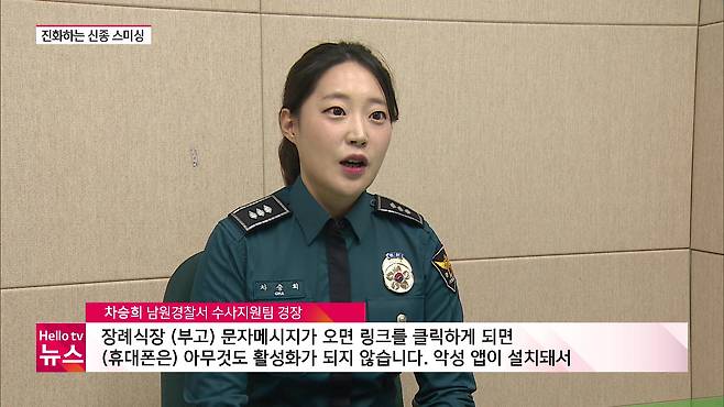 "장례식장 (부고) 문자메시지가 오면 링크를 클릭하게 되면 (휴대폰은) 아무것도 활성화가 되지 않습니다. 악성 앱이 설치돼서 휴대폰에 있는 신분증 사진과 같은 개인정보가 유출되기도 하고요, 소액 결제 시스템을 차단해 놓지 않으면 자동으로 소액결제가 되는... }소액 결제 시스템을 차단해 놓지 않으면 자동으로 소액결제가 되는..."