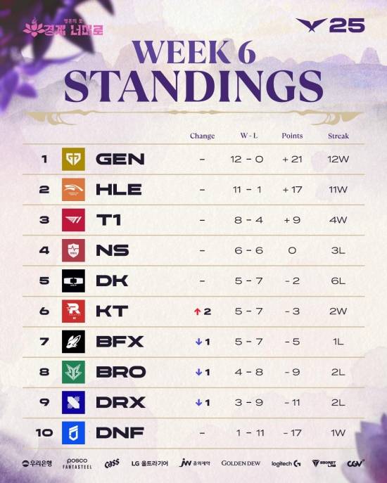6주 차에 의미 있는 연승 기록을 세운 팀은 한화생명e스포츠(HLE). '2025 정규 시즌; 개막전에서 젠지에게 패배한 한화생명e스포츠는 이후 연승을 시작해 5주 차까지 9연승을 달성한 바 있다.