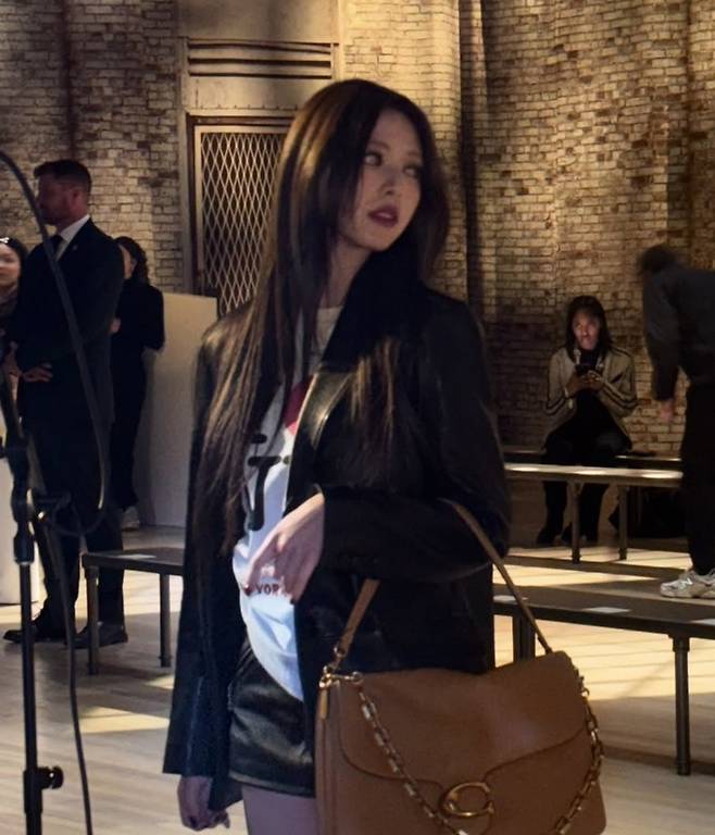 공개된 사진 속 유나는 아이러브 로고 티셔츠와 블랙 가죽 재킷과 미니 스커트 셋업의 하의실종 레더룩으로 각선미를 뽐냈다.