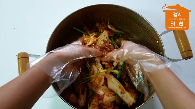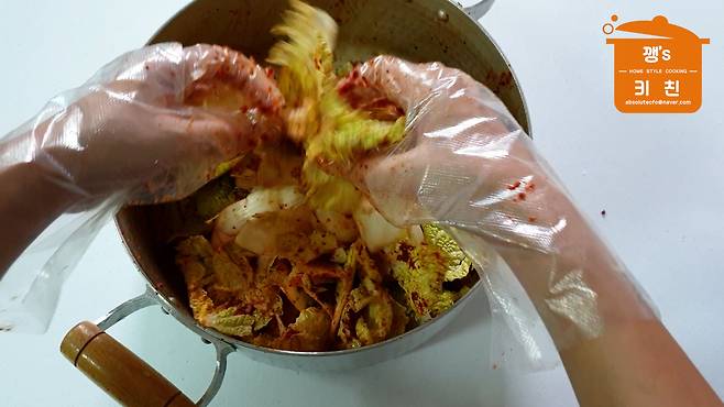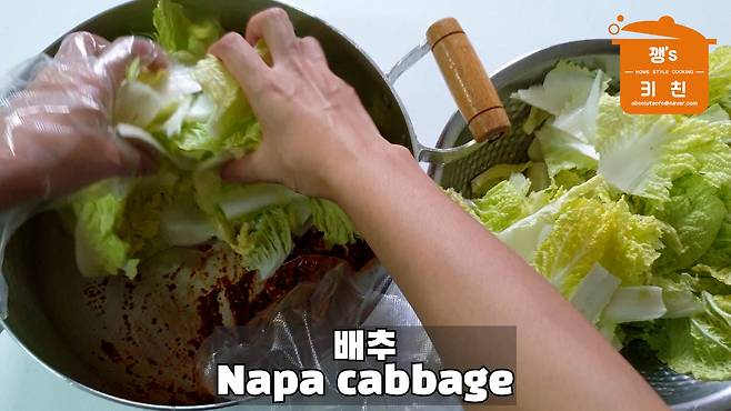 배추에 양념이 버무려지면