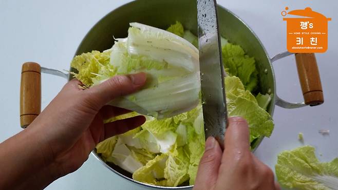 물기 뺀 배추를 잘라주세요