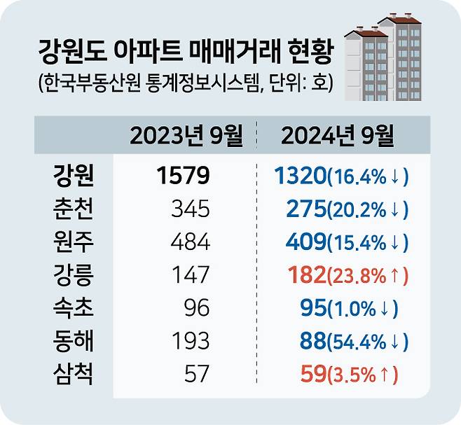 14일 한국부동산원의 아파트매매 거래현황을 보면 지난 9월 강원도 아파트 매매거래량은 1320건을 기록했다. 지난해 9월(1579건)보다 259건(16.4%) 줄었다.