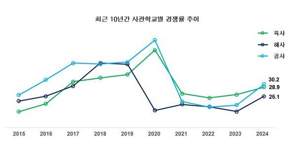최근 10년 자료를 분석해 보면 남자 신입생의 평균 경쟁률은 육사가 23.4:1, 해사와 공사는 각각 22.3:1, 27.6:1이다. 여자 신입생의 경쟁률은 훨씬 높다. 육·해·공사별로 각각 70.6 : 1, 55.1 : 1, 67.6 : 1까지 이르고 있어 사관학교에 대한 여성의 선호도가 남다르다.