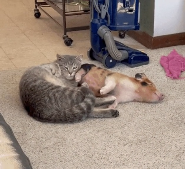결국 아기 돼지와 고양이는 한 덩어리가 된 채 세상에서 가장 편안한 자세로 함께 휴식을 만끽했습니다.