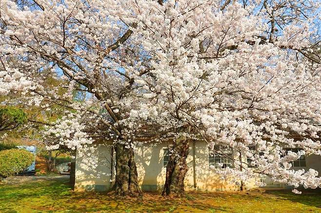 흐드러지게 핀 벚꽃이 고풍스러운 건축물과 어우러져 마치 한 폭의 수채화를 연출하며, 과거의 시간 속에 봄이 머물다 간 듯한 느낌을 줍니다.