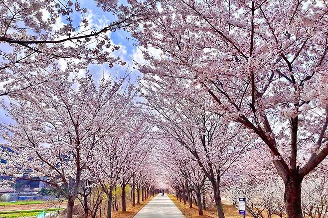 동해시를 대표하는 벚꽃 명소로 꼽히는 전천 제방길은 길 양옆으로 벚꽃이 빽빽하게 늘어서 있어 마치 꽃으로 만든 터널을 걷는 듯한 착각을 일으킵니다.