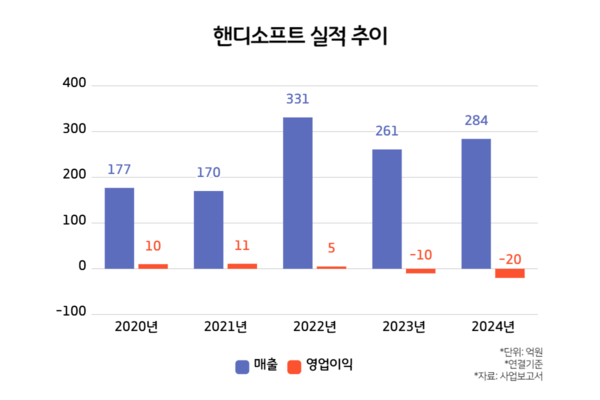 핸디소프트의 실적은 하향곡선을 그리고 있다. 회사의 지난 5년간 연결기준 실적을 보면 매출은 2020년 177억원에서 2022년 331억원까지 늘었지만 2023년 261억원으로 줄었다. 2024년 반등에 성공해 284억원으로 매출이 소폭 늘었지만 영업손실을 냈다. 회사는 2020년부터 2022년까지 연간 10억원 내외의 영업이익을 냈지만 2023년 10억원, 2024년 20억원의 영업손실을 기록했다. 그럼에도 폴라리스오피스그룹이 핸디소프트를 인수한 것은 별도기준으로는 여전히 영업이익을 낸 가운데 신생 종속회사의 성장세에도 주목했기 때문이다. 폴라리스오피스그룹 관계자는 "핸디소프트의 종속회사가 여전히 성장단계에 있다보니 연결기준으로는 영업손실이 났지만 별도기준으로는 영업이익을 내고 있다"고 말했다.