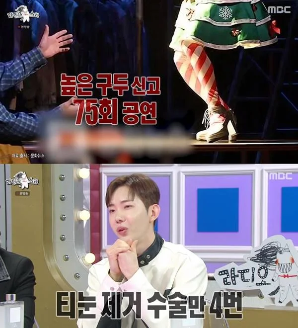 가수이자 뮤지컬 배우로 활약 중인 조권이 발바닥 티눈 수술을 무려 4번이나 받았다고 고백했다. 겉으론 화려해 보이는 무대 뒤에는 그의 고통스러운 발이 있었다. 조권은 최근 MBC ‘라디오스타’에 출연해 “뮤지컬에서 높은 구두를 신고 75회 공연을 했다”며 “공중에서 점프해 착지하는 장면이 반복되다 보니 발에 무리가 가 티눈이 생겼다”고 밝혔다.
